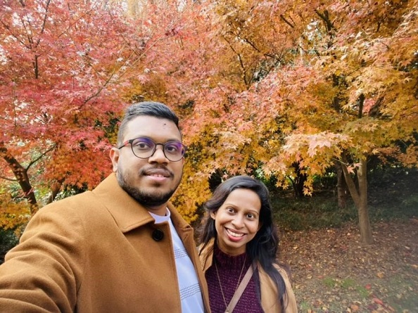 The author and his wife take a photo during autumn in Wuxi. [Photo provided by Achala Herath to wuxi.gov.cn]