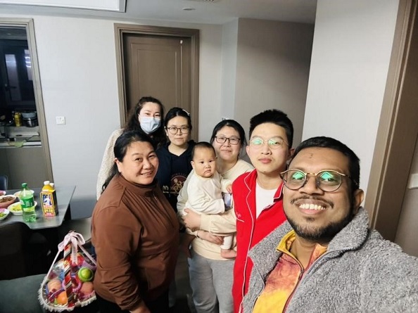 The author poses for a selfie with his family at Nanchang Street. [Photo provided by Achala Herath to wuxi.gov.cn]